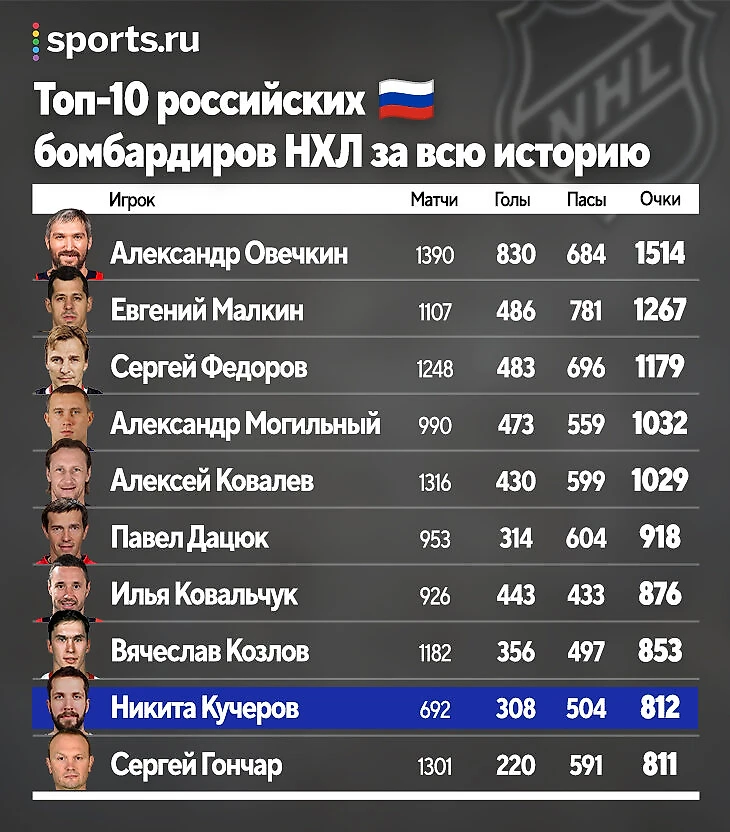 Кроме того, 30-летний Кучеров вышел на девятое место среди российских бомбардиров в истории НХЛ – набрал 812-е (308+512) очко в карьере и обогнал экс-защитника Сергея Гончара. В среднем в лиге Никита набирает 1,17 балла за матч регулярного чемпионата.