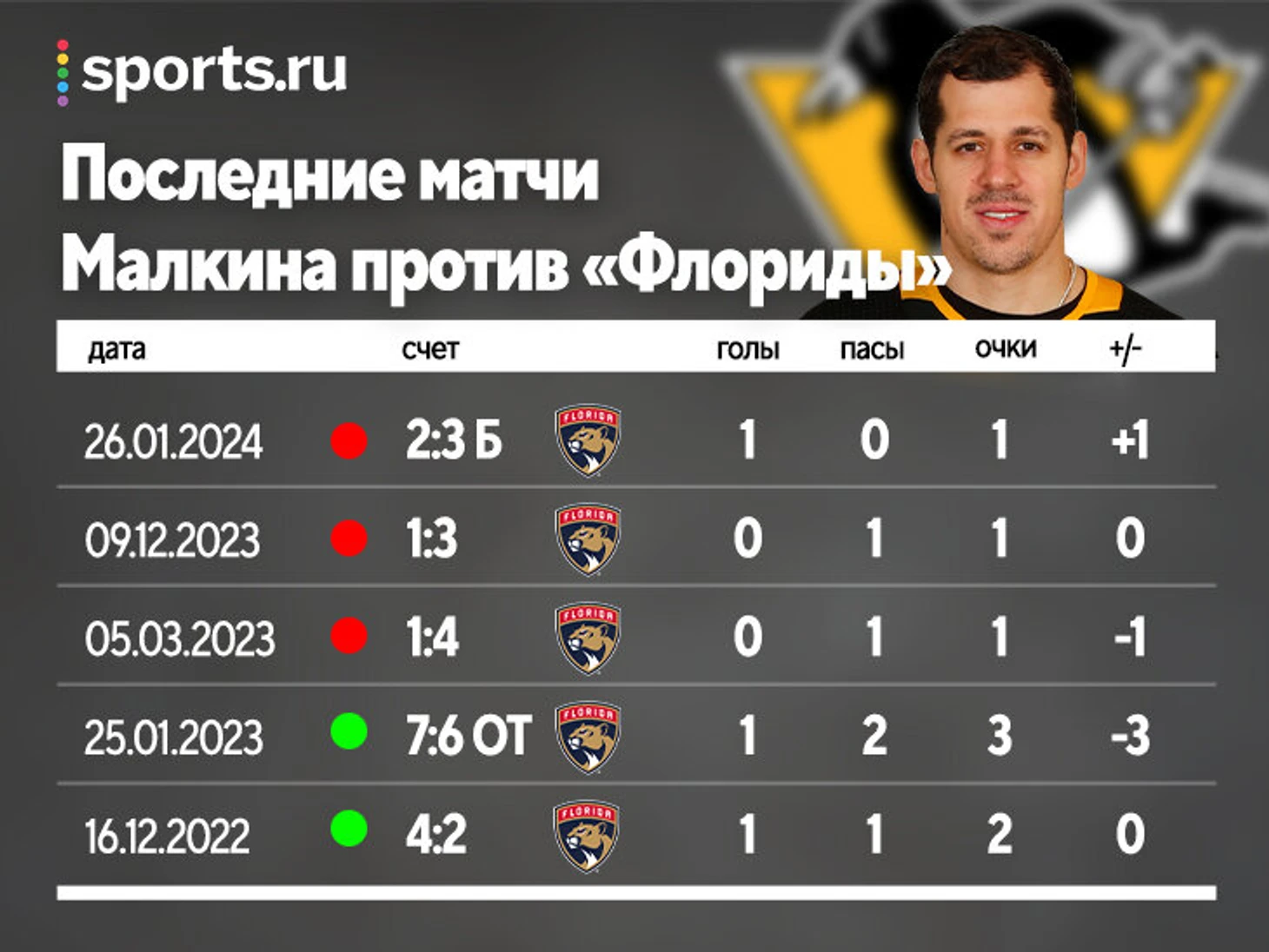 В последних пяти матчах с «Флоридой» Малкин всегда набирал баллы за результативность, хотя дважды «Питтсбург» забрасывал не больше одной шайбы. На этом отрезке у него 8 очков. Похоже, «Пантерс» – его клиенты.