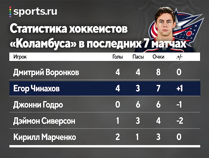 Несмотря на наличие трех наших нападающих в составе, русская тройка в «Блю Джекетс» на постоянной основе так и не сложилась. У главного тренера Паскаля Венсана на них другие планы. 7 января в игре с «Миннесотой» (3:4 ОТ) он впервые попробовал в другом сочетании Воронкова, а с 14 января (поражение «Сиэтлу» 4:7) выпускает Чинахова в первой тройке с Годро и Силлинджером.