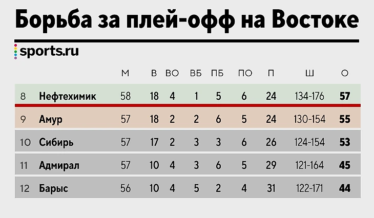 Интересно, что «Барыс», который мог включиться в гонку после того, как с «Сибири» сняли очки, вообще улетел на последнее место в конференции. И это немного обнадеживающие новости для Хабаровска.