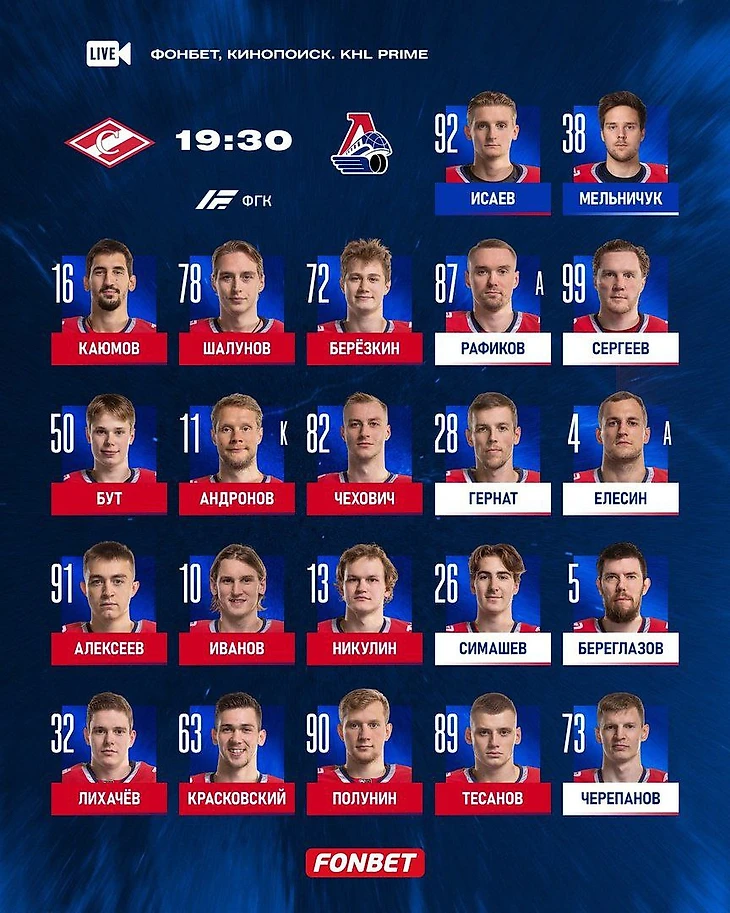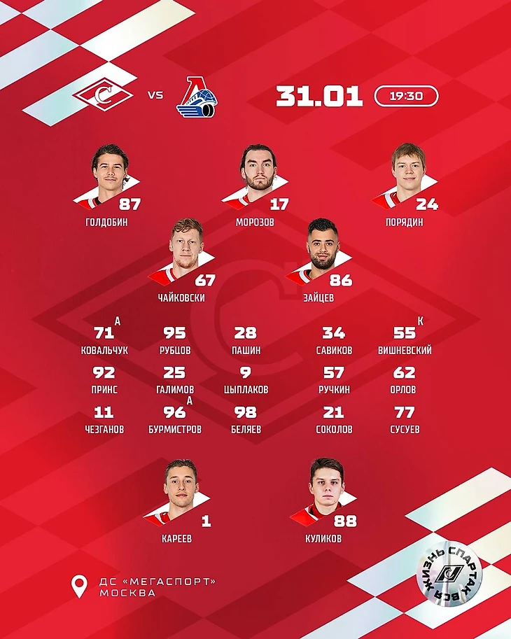 Состав хоккейного «Спартака» в сегодняшнем матче