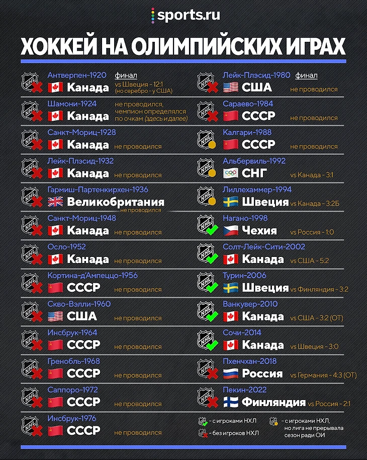 Сколько раз НХЛ отказывалась от Олимпиад?