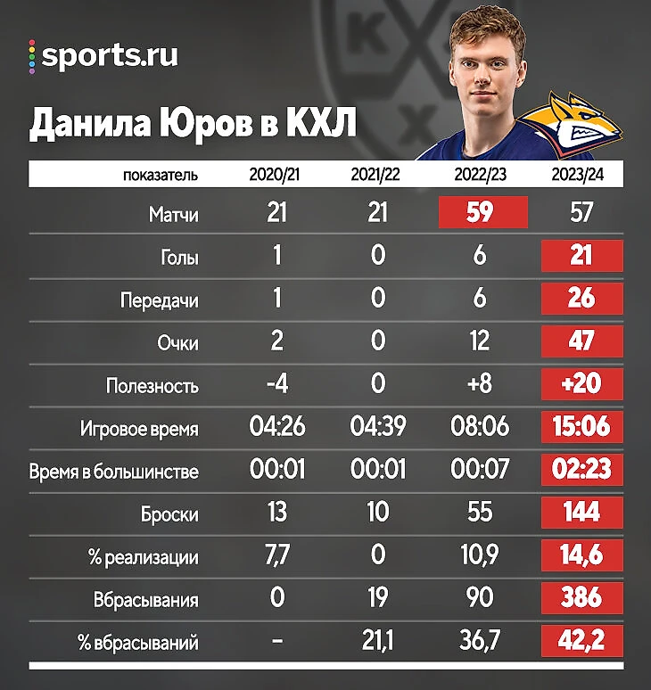 Та вспышка оказалась разовой. Дальше по сезону Юров не набрал ни одного очка и играл в среднем меньше 10 минут. Такой же ситуация осталась и в регулярке-2021/22: 0 очков в 21 игре и среднее время 04:39. По сути, в эти сезоны Данила выступал на две лиги: сопоставимое количество матчей он провел и за «Стальные Лисы» (46 в МХЛ и 42 в КХЛ).