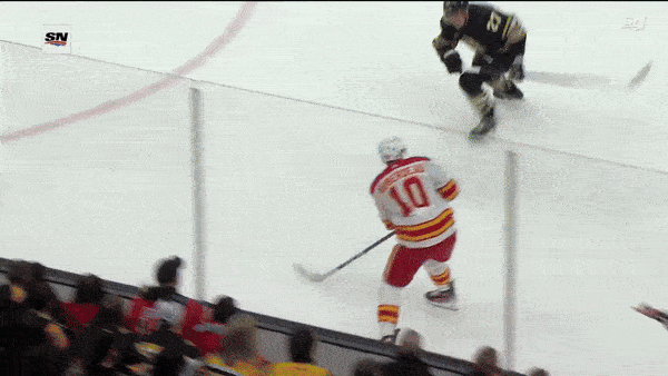 Поскольку «Калгари» уже не особо держится за лучших игроков, Кузьменко сразу попал в первое звено – к закисшему Юбердо и сверкающему Шаранговичу, а также в первую бригаду большинства. Заработало моментально: на гол у Андрея ушло лишь 96 секунд – «Бостон» остался в меньшинстве, и Кузьменко на пятой минуте матча распечатал ворота Джереми Сваймена.