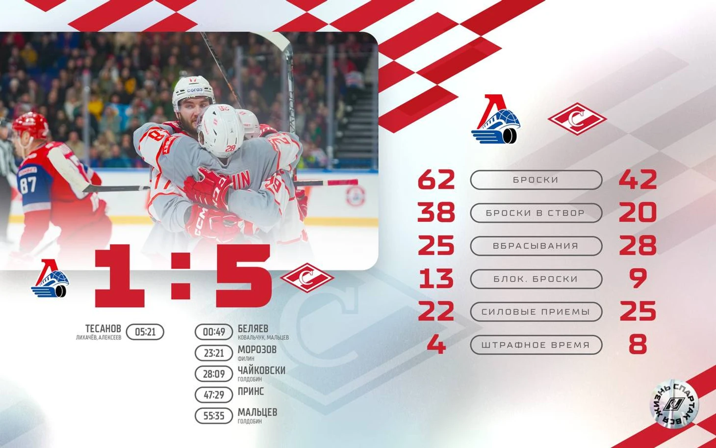 «Локомотив» быстро отыгрался благодаря голу Даниила Тесанова. Во втором игровом отрезке спартаковцы забили дважды усилиями Ивана Морозова и Михала Чайковски, а в заключительной двадцатиминутке Шэйн Принс и Михаил Мальцев довели счёт до крупного.