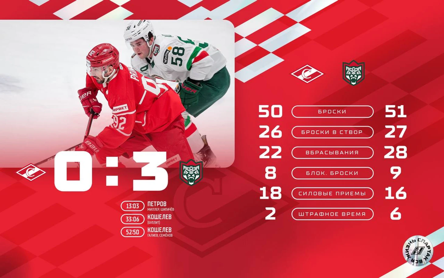 В середине третьего периода Кошелев окончательно застолбил за собой звание героя матча — он открылся на пятаке под передачу Станислава Галиева из-за ворот и точно бросил в касание. «Спартак» попытался перевернуть ход матча, но казанцы грамотно сыграли в оставшееся время матча, свели к минимуму опасность возле своих ворот и забрали заслуженную «сухую» победу.