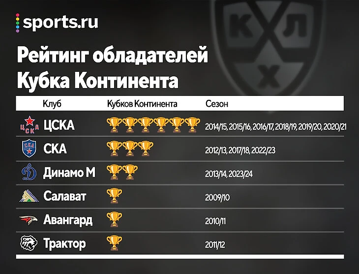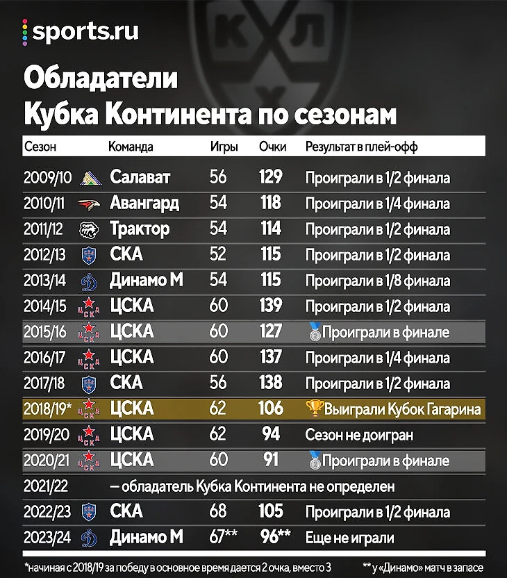 Всего у Кубка Континента набралось шесть обладателей. С сезона-2014/15 в регулярке КХЛ стабильно побеждали ЦСКА или СКА.