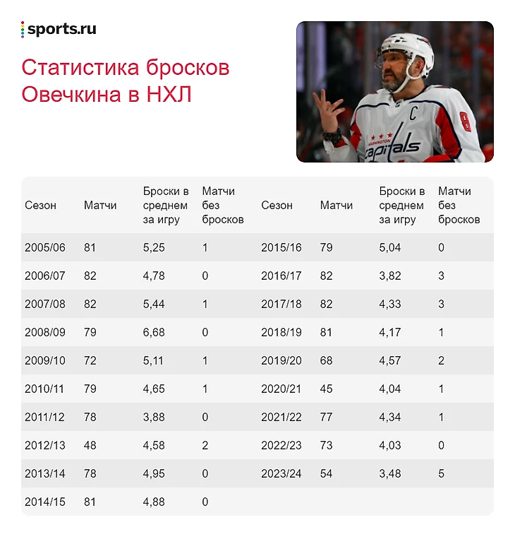 Матч без бросков в створ – нетипичная ситуация для такого снайпера, как Овечкин. Всего это происходило 22 раза за его карьеру. Плохая тенденция наметилась в текущем сезоне – на него приходится почти четверть «сухих» матчей. Кажется, тут дело не только в не самой лучшей форме самого Ови, но и том, что «Вашингтон» уже не тот.