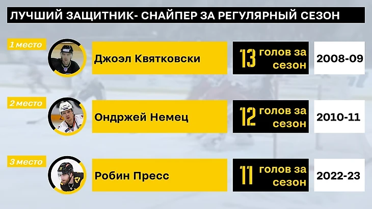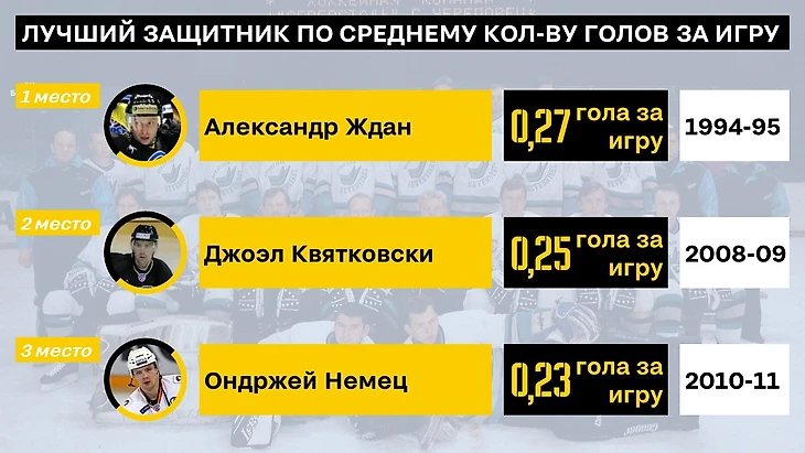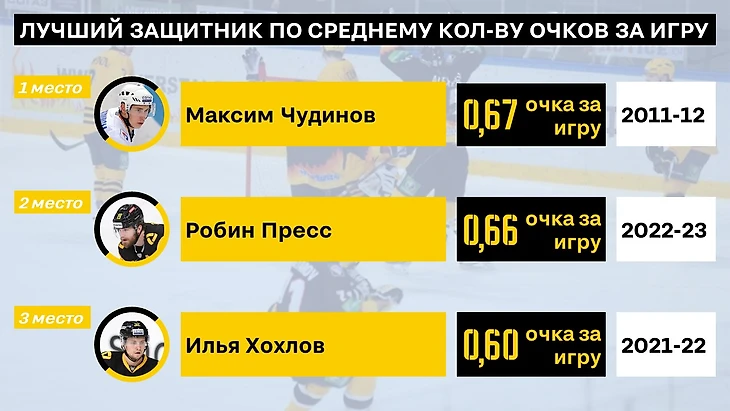 Защитники - бомбардиры. Тут сразу на ум приходит Пресс (еще свежи его рекорды в памяти) и Чудинов. Неожиданно увидеть на 3м месте Юшкевича - но в том сезоне он был лидером всей команды и по очкам и по передачам.