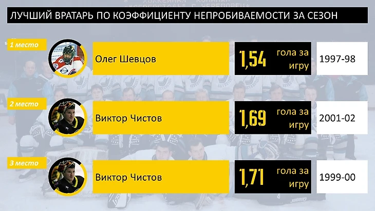 Начнем с классики - коэффициент непробиваемости (кол-во пропущенных голов за игру). Тут явным лидером является Олег Шевцов со своим прекрасным сезоном 97-98, возможно и другие показатели там в порядке, но этот сезон как раз входит в группу «белых пятен» по статистике. После него - целых 2 сезона легенды клуба Виктора Чистова.