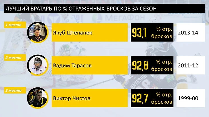 По % отраженных бросков впереди один из Якубов - Штепанек, сразу за ним Тарасов (вроде подменял Кошечкина, но вошел в историю) и снова Чистов.