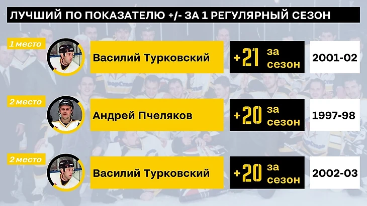 По плюс-минус давно не было хороших результатов, поэтому все рекорды из конца 20 века и начала 21. Два сезона Турковского и один Пчелякова - после них все стало гораздо хуже. Выделялся только Чернов (+19), но немного не добрался до тройки. В этом году (что лично для меня было неожиданным) неплохо себя показал Ильин +14. Может в будущем увидим его в этом списке.
