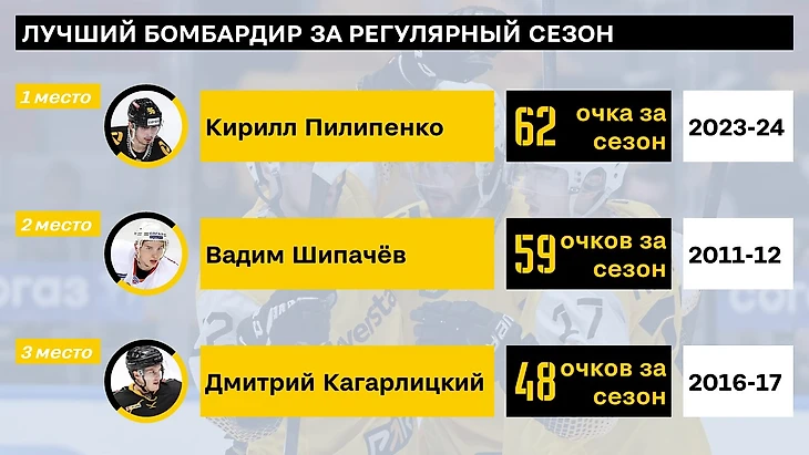 Сначала самый предсказуемый показатель - количество очков за сезон. Тут и новый рекорд Пилипенко и предсказуемые, известные каждому 2 и 3 места: Шипачев и Кагарлицкий.