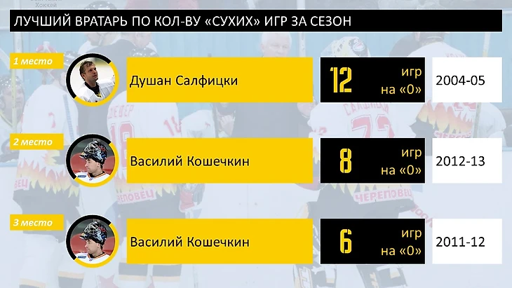 Сухие игры за сезон - умопомрачительные 12 игр за сезон от Душана Салфицки очень сложно повторить, а вот до третьего места Самойлову не хватило одной игры на «0».