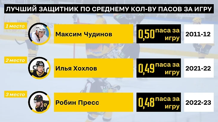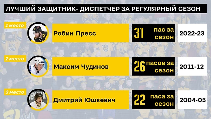 По количеству передач Робин пресс в прошлом сезоне установил рекорд - и явно надолго, что-то подсказывает, что и личным рекордом Пресса в КХЛ останется именно тот сезон. Далее знакомые все лица - череповчане Чудинов и Юшкевич.