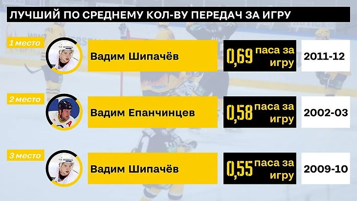 В пересчете передач на игру борьбы гораздо меньше - тут и Шипачев вне досягаемости (в тройку вошли целых 2 его сезона) и на втором месте закрепился Епанчинцев - диспетчер из медальной михалёвской эпохи Северстали.