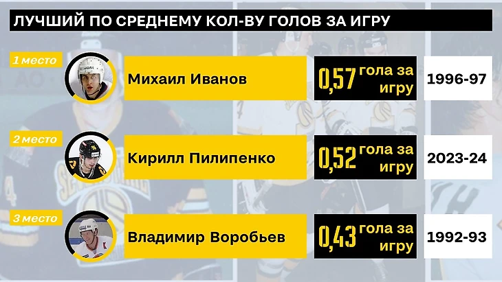 А вот по голам за матч уже Михаил Иванов держит лидерство - чтобы догнать его, Пилипенко нужно было забить 36 голов. На третьем месте оказался Владимир Воробьев из первого в высшей лиге сезона.
