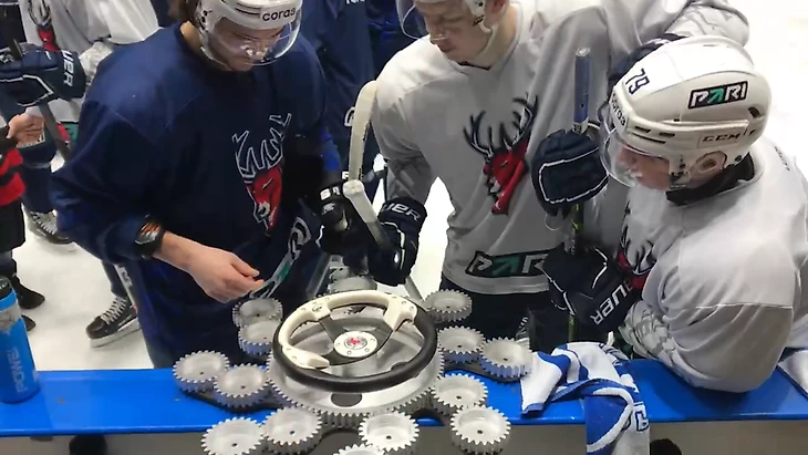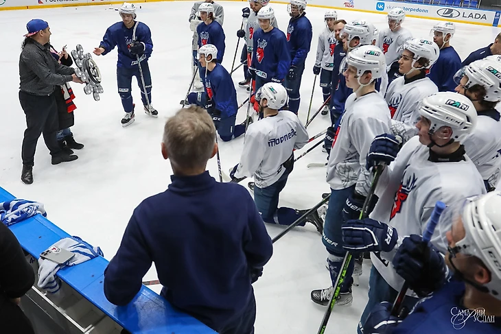 По окончании тренировки команда собралась в центре площадки – настраивалась на плей-офф. Казалось, что вот-вот начнется общение журналистов с игроками и главным тренером, но слово взяли болельщики, которые подоспели к концу тренировочного процесса. Команде была вручена инсталляция в виде спортивного руля с легендарным оленем по центру и расположенными на нем 16-ю шестерёнками. Каждая шестеренка олицетворяет сектор КРК «Нагорный» - 14 секторов + два балкона расположено на арене. После каждой, даст Бог, победы, шестеренка будет заполняться шайбой.