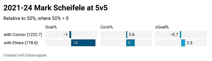 Ниже статистика Марка Шайфли за последние три сезона в равных составах, когда он играл вместе с Элерсом и Коннором. Получается, что с Элерсом в первом звене команда забивает значительно больше, чем пропускает, создает больше опасных моментов и в целом контролирует ход игры.