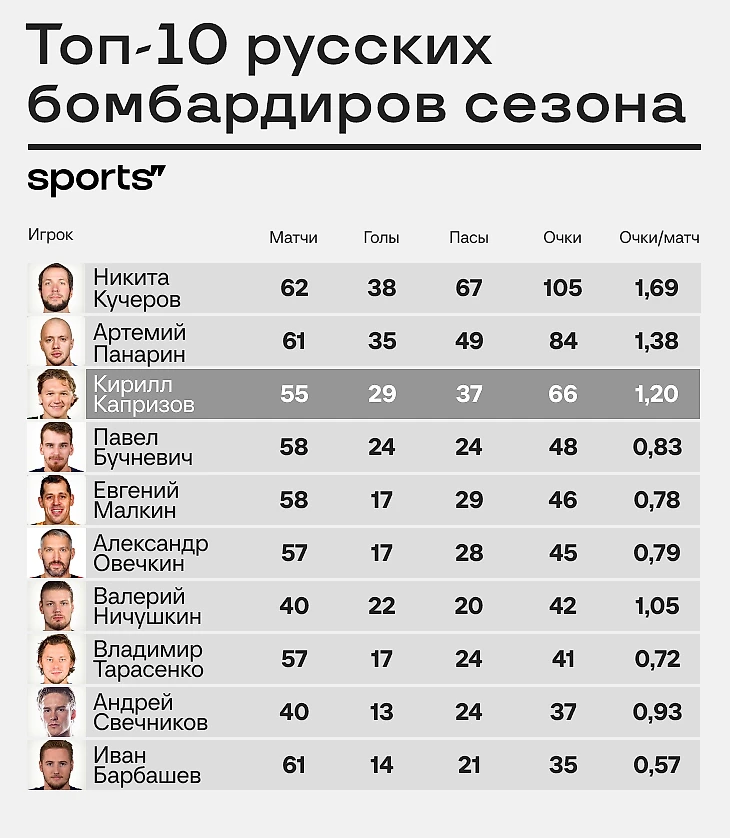 В списке лучших бомбардиров среди россиян Капризов прочно закрепился в топ-3.