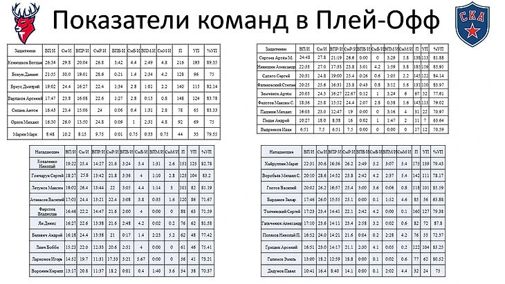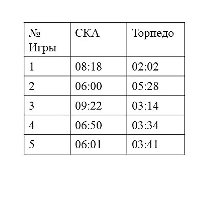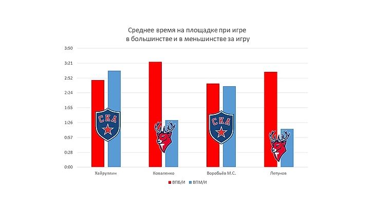 Из таблицы видно, что время у трех игроков «СКА» переваливает за 20 минут, в среднем проведенных на льду. Конечно, причиной такого количества игрового времени для хоккеистов связано с игрой в неравных составах. Но у команды «Торпедо» больше игрового времени в большинстве (20 попыток, 33:42 минут игры в большинстве), чем у «СКА» (17 попыток, 27:58 минут игры в большинстве).