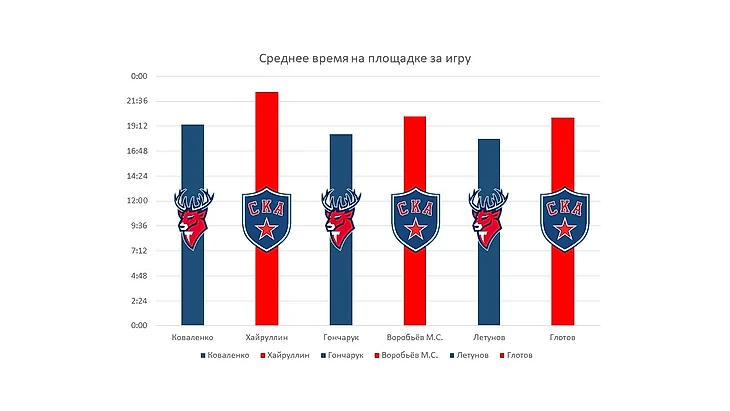 Если посмотреть на среднее время на площадке за игру («ВП/И») «Торпедо» и «СКА», сравнив их, то мы увидим, что тренерский штаб нижегородцев равномерно распределяет нагрузки игроков. А вот тренерский штаб петербуржцев наоборот, использует своих лидеров на максимум.