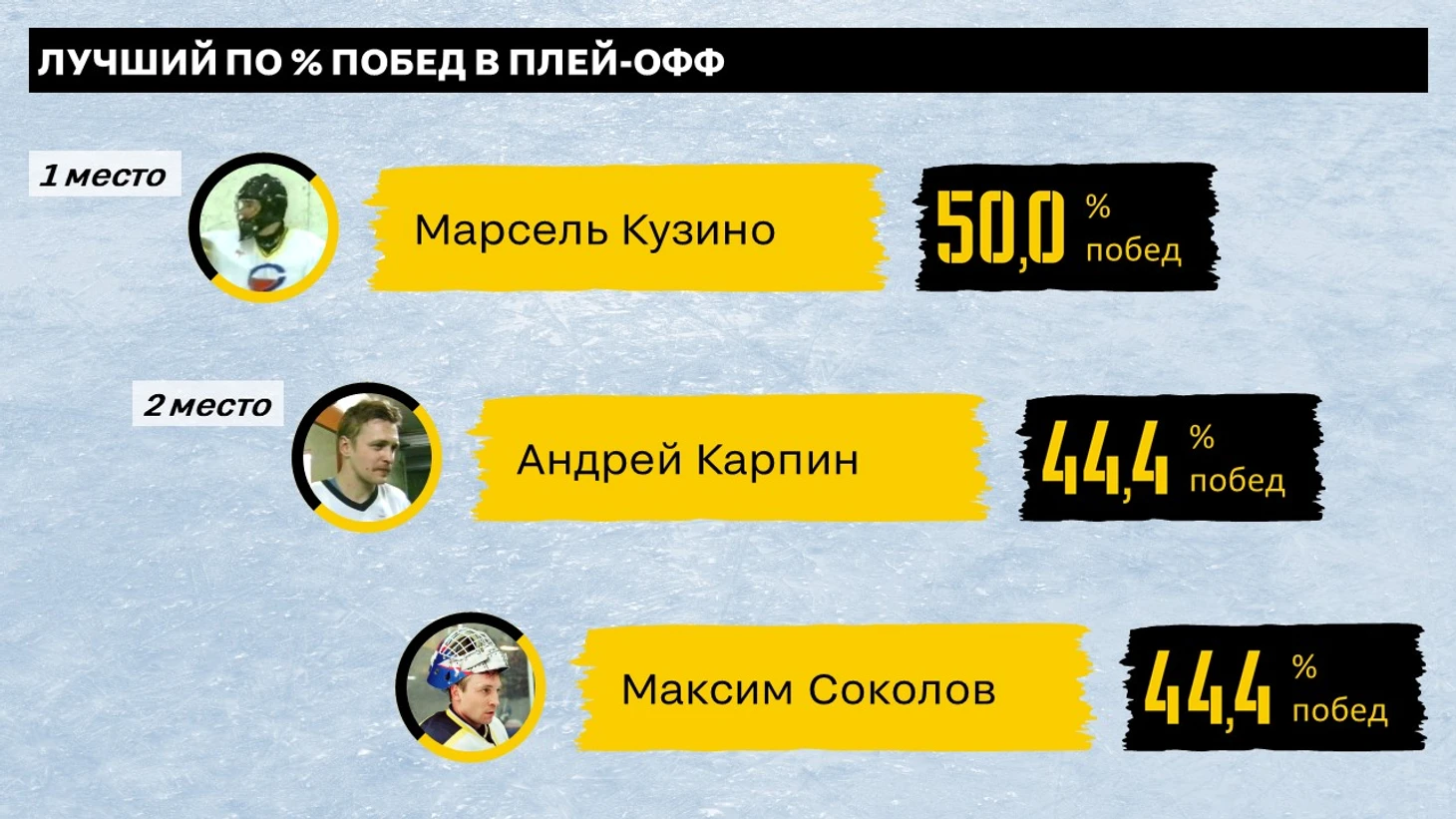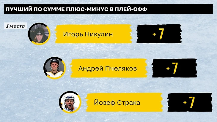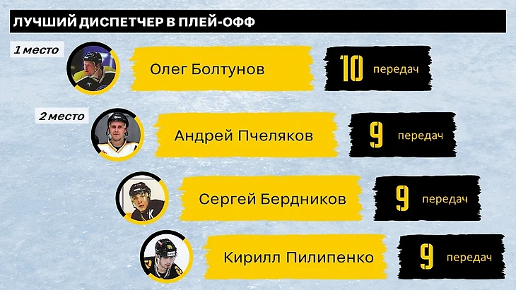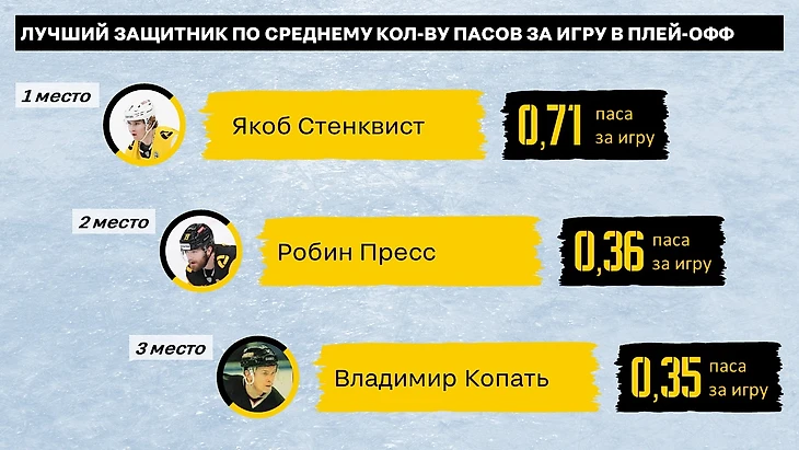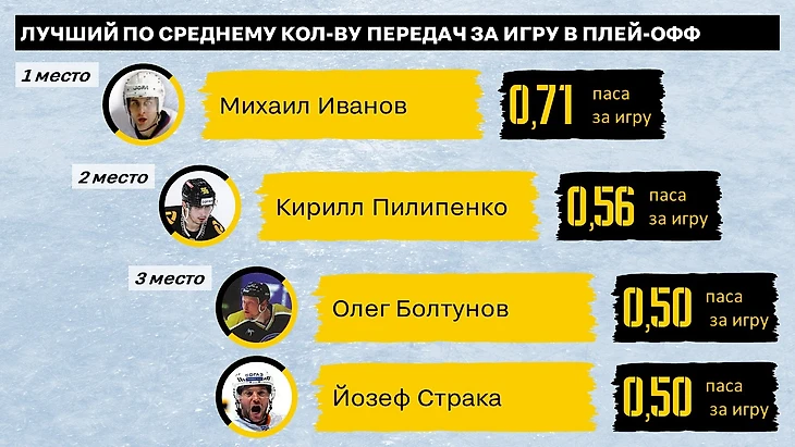 По среднему же количеству передач Кирилл попал даже на второе место. А вот на 1-м Михаил Иванов забравший все первые места по эффективности игры в плей-офф. На 3 месте достаточно неожиданно видеть Йозефа Страку - он обычно больше ассоциируется с голами, а не передачами.