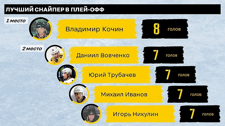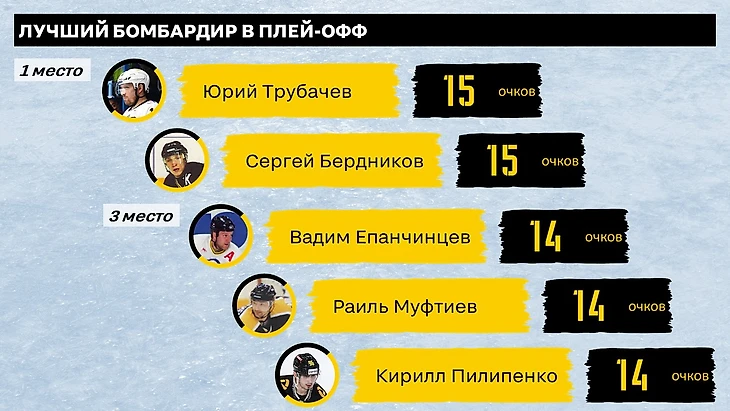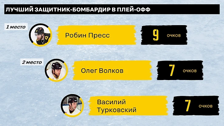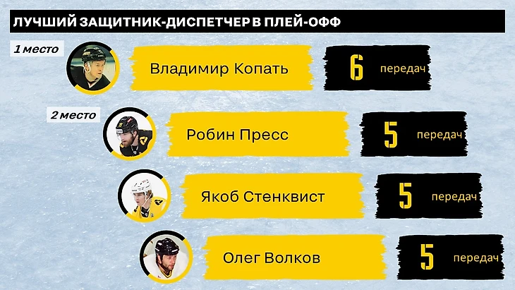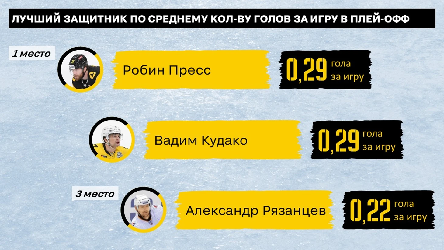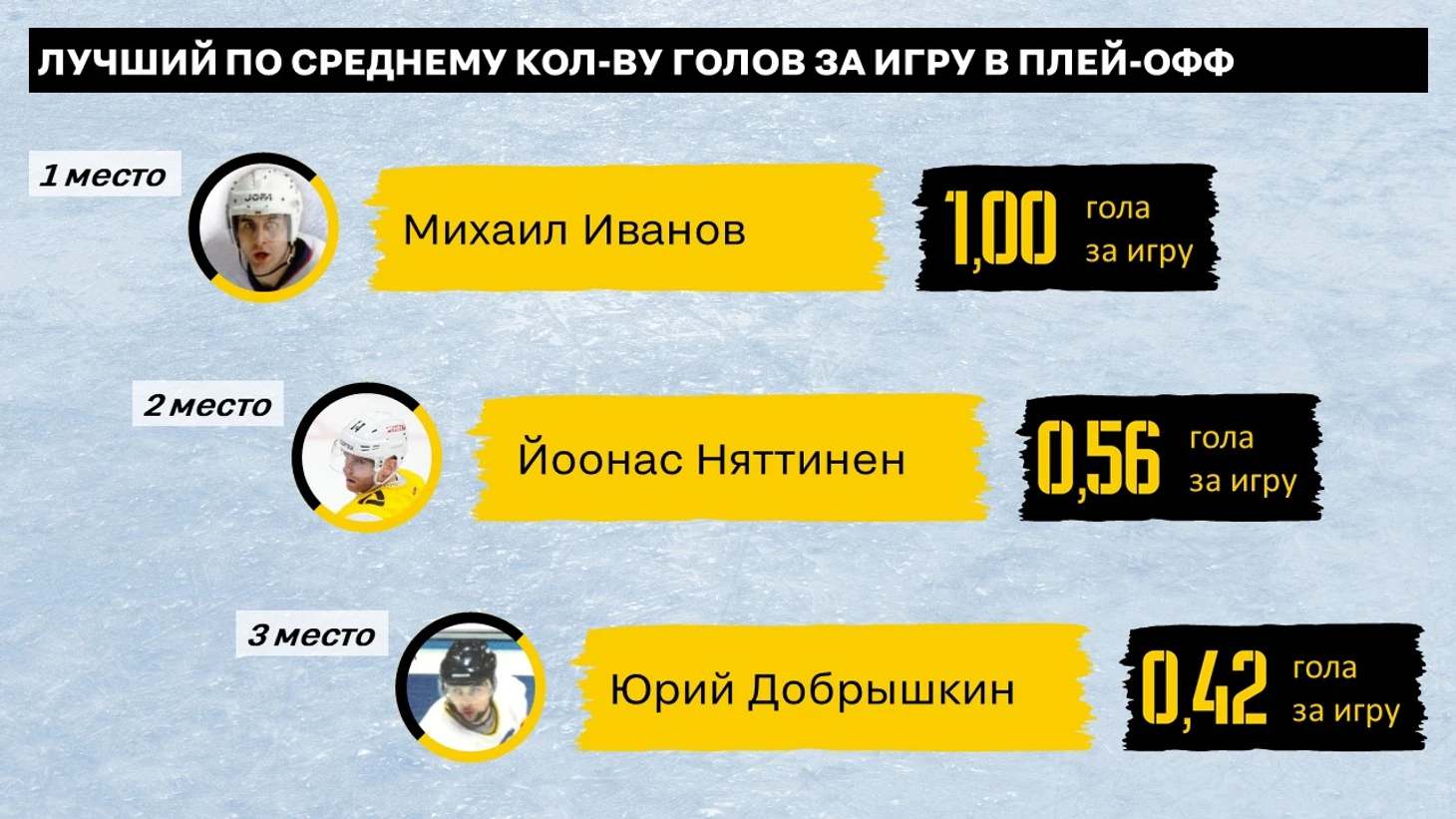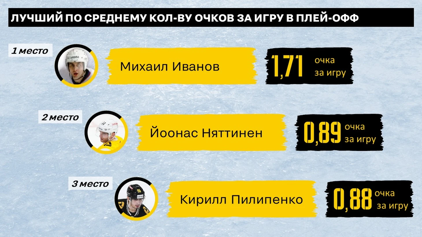 В пересчете на игру нет равных Михаилу Иванову: за игры в плей-офф двух сезонов он набрал 12 очков всего в 7 играх. Няттинен и Пилипенко идут «ноздря в ноздрю».