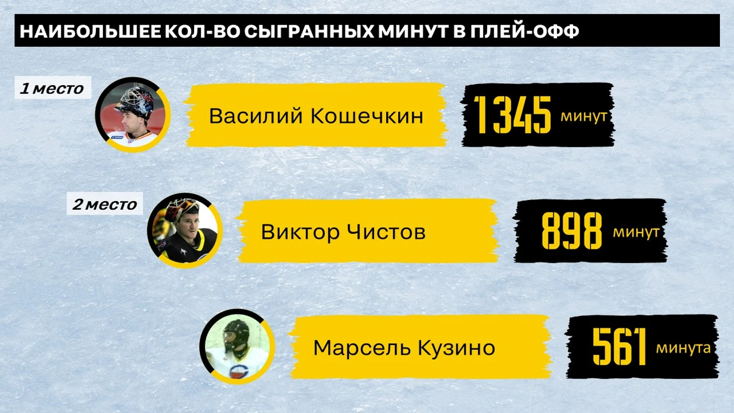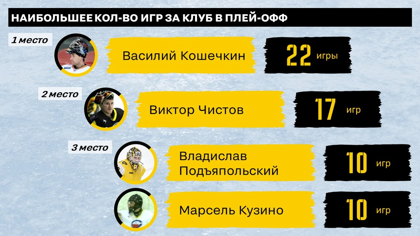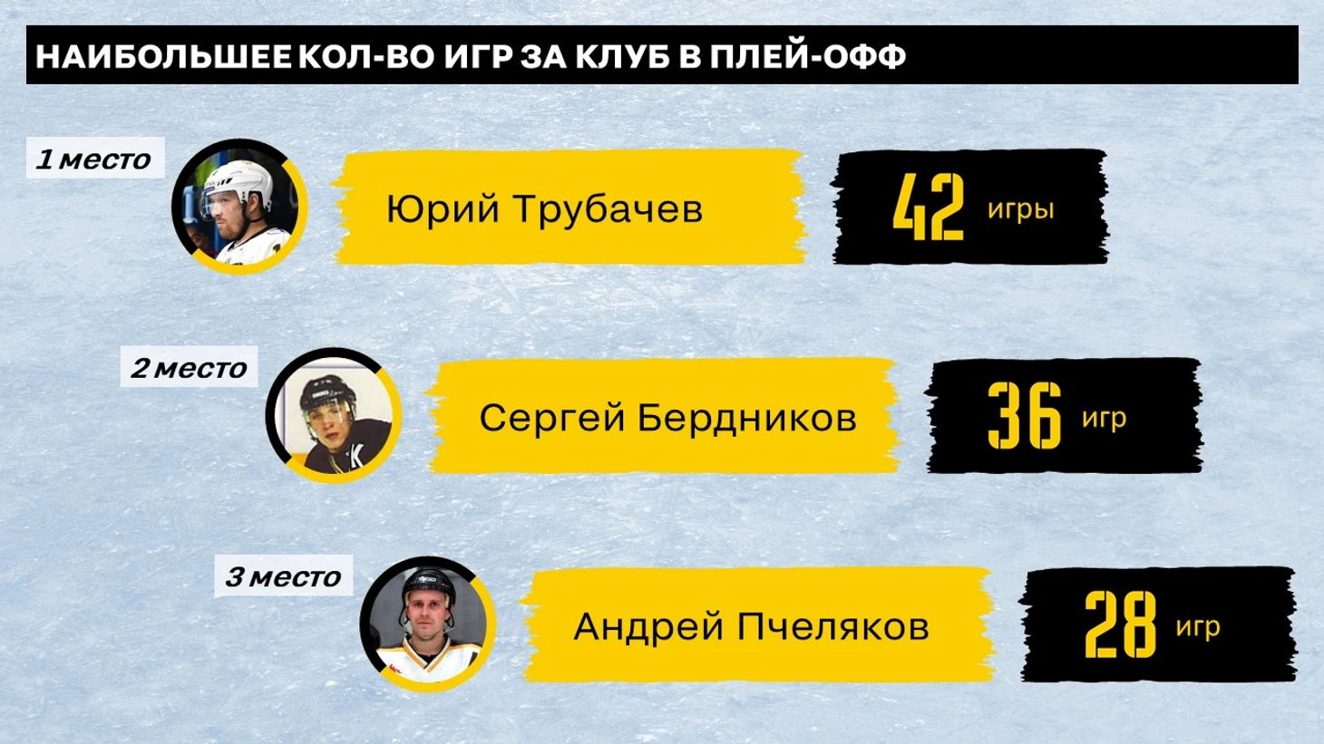 Больше всех игр в плей-офф (как и регулярках) сыграл Юрий Трубачев. Из игроков текущего состава ближе всех Гуслистов и Лишка (23 и 22 матча соответственно).