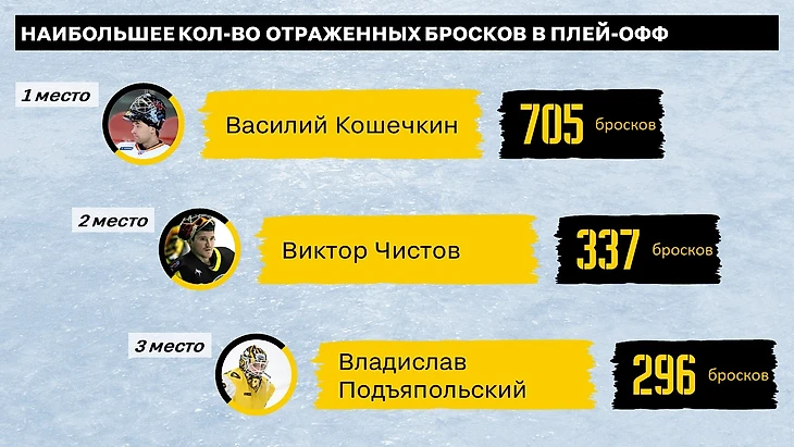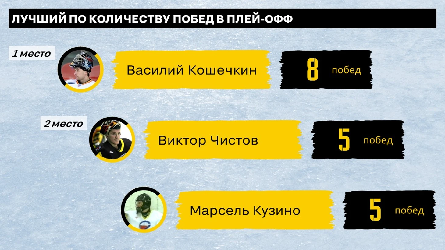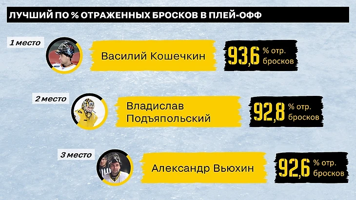 % отраженных бросков очень хорош у всей тройки, но у Кошечкина все же лучше - почти 94%! Для плей-офф это особенно шикарные цифры.