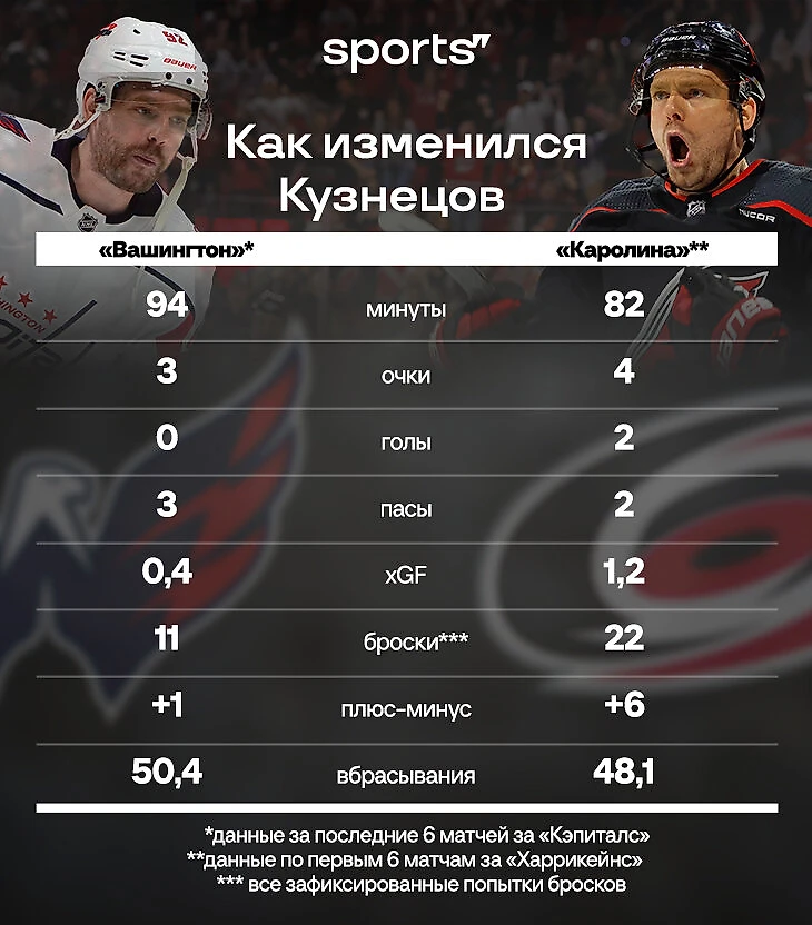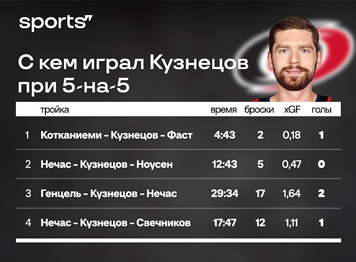 Кузнецов не спасает «Каролину», но в то время, когда он находится на льду, «Каролина» выигрывает.