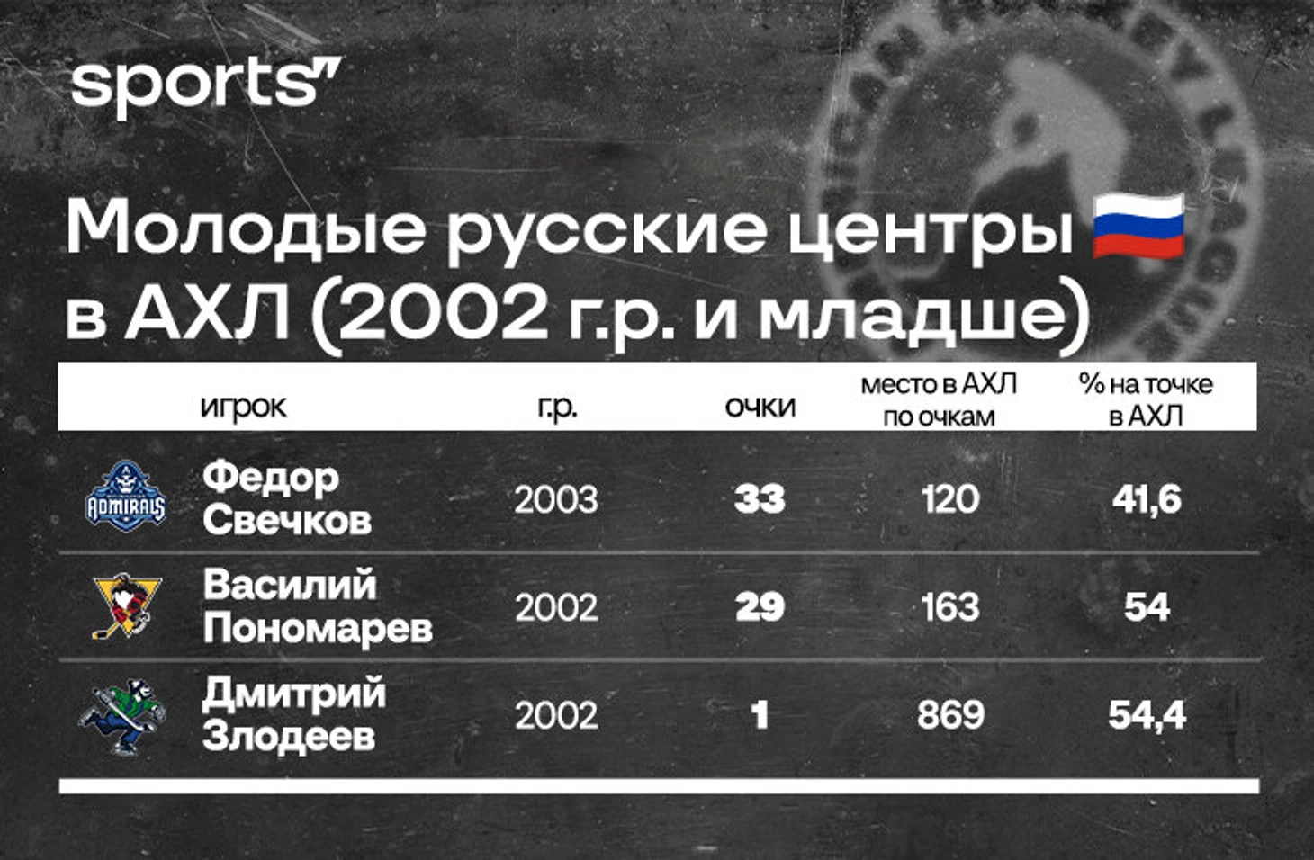 Свечков играет в АХЛ первый сезон и проводит его неплохо, несмотря на пугающее 120-е место среди бомбардиров (среди новичков Федор в начале третьего десятка). Во всяком случае, начало оставляет надежду на позитивное будущее в НХЛ. Но смущает очень слабый процент на точке, который и в КХЛ у него был немногим лучше (43,1). Злодеев играет редко и мало – и уже довольно очевидно, что большой игрок из него вряд ли получится. Тем более что и Свечков с Пономаревым – это, скорее, игроки нижних звеньев, не топы.