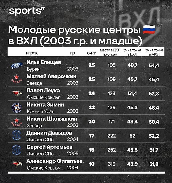 Никто из больших талантов на этом уровне не блистал и не задерживался. Исключения есть, но это парни, которые здесь хорошо смотрелись уже в 18-19 лет (Чибриков, Свечков, Аймурзин, Иванцов – человек десять, не больше). Но в этом сезоне таких не видно. Поэтому по ВХЛ ограничимся таблицей.
