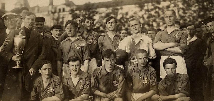 11 июня 1922 года. Москва. Площадка Замоскворецкого клуба спорта / ЗКС (ул. Большая Калужская). ОЛЛС - МКС - 4:2. Победители весеннего первенства Московской футбольной лиги футболисты ОЛЛС позируют с призом за победу Кубком КФС-«Коломяги». Дмитрий Маркович Ребрик в кепке с белым верхом - первый слева в верхнем ряду