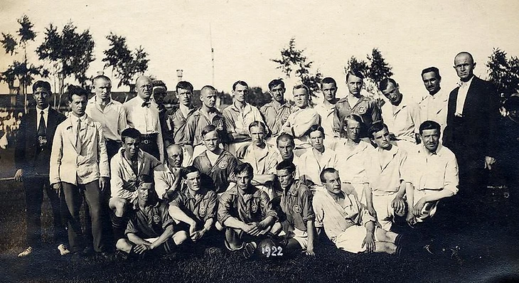 9 июля 1922 года. Орехово-Зуево. Стадион КСО. «Клуб спорта Орехово» - ОЛЛС - 4:2 (2:2). Председатель ОЛЛС Д.М. Ребрик стоит четвертым слева (cska-games.ru)