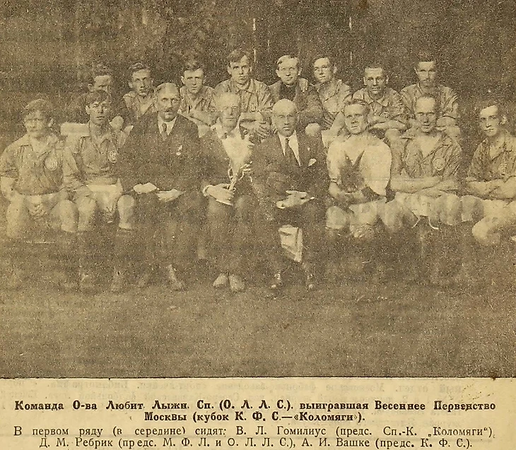 Июнь 1922 года. Футбольная команда «Общества любителей лыжного спорта», выигравшая весеннее первенство Москвы 1922 года (Кубок КФС-«Коломяги»). Председатель ОЛЛС Д.М. Ребрик с призом в руках (журнал «Известия спорта» № 2 от 15 июля 1922 года)