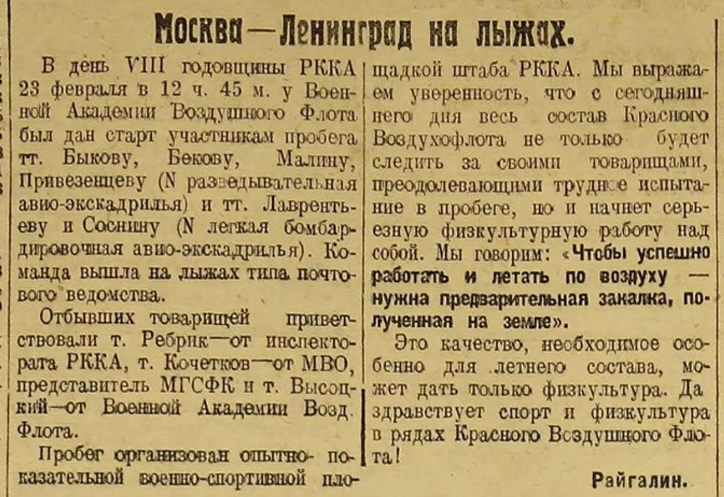 23 февраля 1926 года. Ребрик от лица инспектората РККА приветствует участников лыжного пробега в четь VIII годовщины РККА (газета «Красный спорт» № 9 от 28 февраля 1926 года).