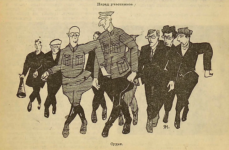 6-10 сентября 1922 года. Первенство Республики (РСФСР) по легкой атлетике. «Парад участников. Судьи» (рисунок из журнала «Известия спорта» № 9 от 19 октября 1922 года)