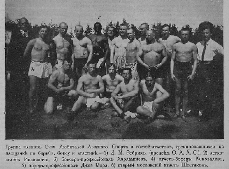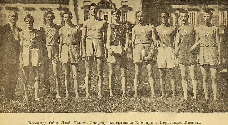 30 июля 1922 года. Москва. Стадион Института физической культуры (ул. Гороховская, 20). Первенство Москвы по легкой атлетике. Команда «Общества любителей лыжного спорта», выигравшая командное первенство Москвы 1922 года и главный судья первенства председатель ОЛЛС Д.М. Ребрик (журнал «Известия спорта» № 4 от 16 августа 1922 года)