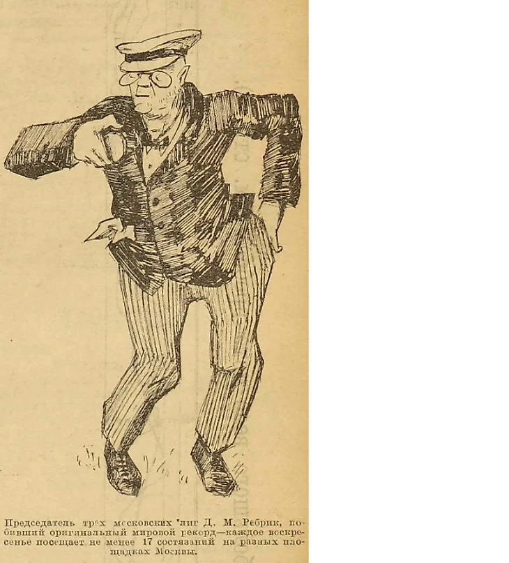 Август 1922 года. «Председатель трех московских лиг Д.М. Ребрик, побивший оригинальный мировой рекорд - каждое воскресенье посещает не менее 17 состязаний на разных площадках Москвы» (рисунок из журнала «Известия спорта» № 5 от 28 августа 1922 года)