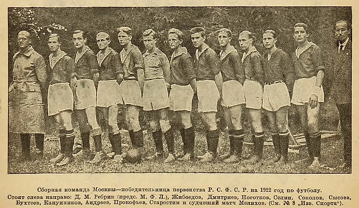 17 сентября 1922 года. Москва. Сокольническая роща. 4-й Лучевой просек. Спортплощадка ОЛЛС. Первенство РСФСР (Республики) по футболу. Финал. Москва - Харьков - 8:0. Председатель Московской футбольной лиги Д.М. Ребрик - первый слева (журнал «Известия спорта» № 9 от 19 октября 1922 года)