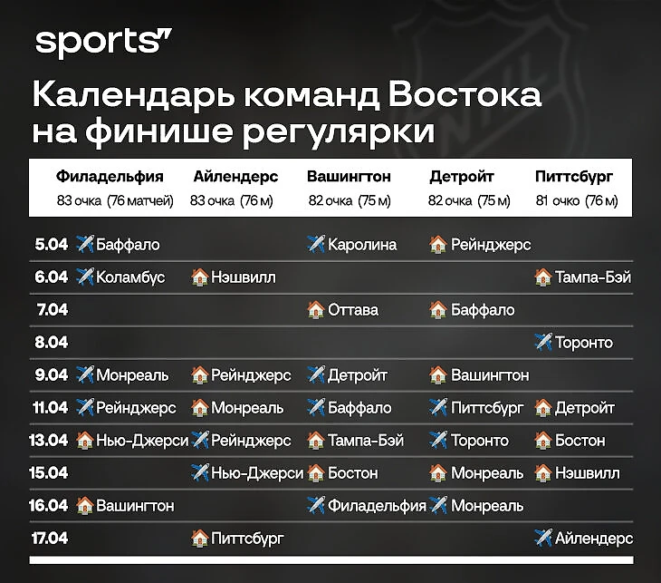 ● У «Филадельфии» в календаре есть «Коламбус» и «Монреаль», что явно добавляет фанатам оптимизма (но ничего не гарантирует), плюс почти попрощавшиеся с сезоном «Баффало» и «Нью-Джерси». И это был бы повод считать «Флайерс» фаворитами, если б не их серия из 5 поражений и лютые проблемы с вратарями (они как дети радуются приезду Федотова, у которого получился довольно средний сезон в ЦСКА).