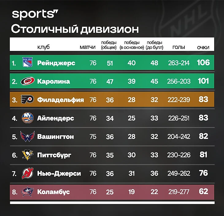 А теперь сравните с третьим местом в Столичном – это все команды Восточной конференции. Кстати, чтоб было понятно, почему «Филадельфия» выше «Айлендерс»: у «Флайерс» больше побед в основное время (было бы поровну – смотрели бы победы до буллитов, если б и там равенство – общее количество побед, дальше бы в ход пошли личные встречи, а потом – и разница голов).