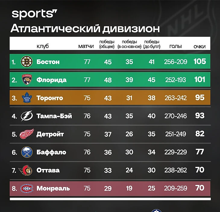 А вот то, что у команды с седьмого-восьмого места будет лучше результат, чем у тех, кто попал в топ-3 в соседнем дивизионе – вообще обыденность. Кажется, в этом сезоне так случится с «Тампой» или «Торонто». Посмотрите на количество их очков в Атлантическом (если что: зеленым выделены клубы, кто уже гарантировал участие в плей-офф, красным – кто точно уже не попал туда).