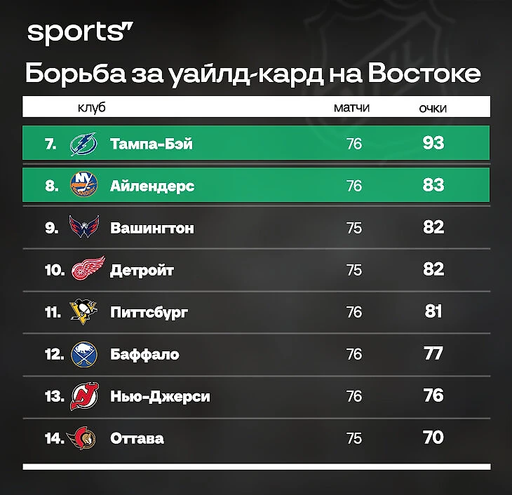 Очевидно, что «Тампа» с таким количеством очков уже никуда не подвинется (наоборот, может спихнуть в уайлд-кард «Торонто» – но и те не подвинутся), поэтому на первый взгляд на Востоке идет розыгрыш одной путевки.