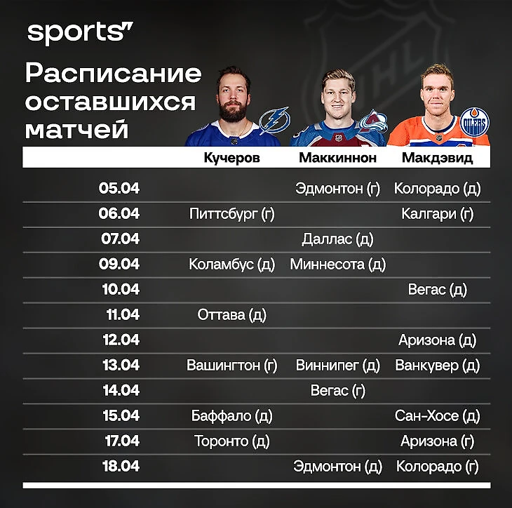 Историческая гонка за индивидуальными наградами НХЛ близка к развязке. Конкуренты по списку бомбардиров разрывают лигу уже в один день: пока Нэтан Маккиннон тащил с «Миннесотой» (5:2), Никита Кучеров разбирался с «Монреалем» (7:4).