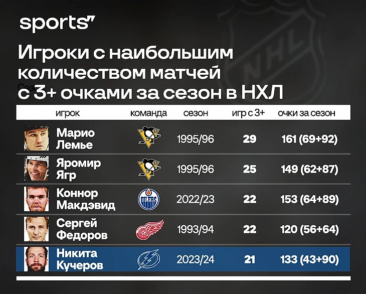 ● Игра с «Монреалем» стала 21-й с тремя и более очками у Кучерова в текущем сезоне. Это пятый результат за 30 лет. В прошлой регулярке у Макдэвида таких матчей было 22 – Кучеров вполне может догнать.