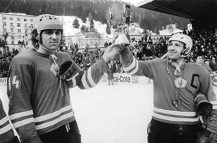 31 декабря 1973 года. Давос. Кубок Шпенглера. «Трактор» (Челябинск) - «Слован» (Братислава) - 2:4. Вацлав Недомански и Штефан Кордиак с трофеем (ice-hockey-stat.com)