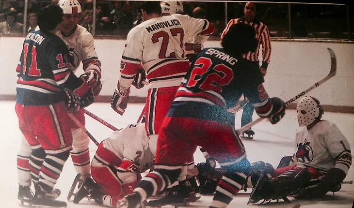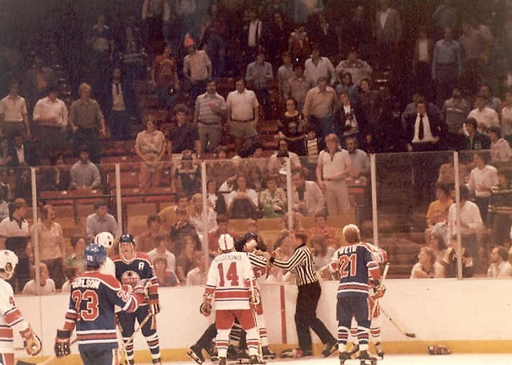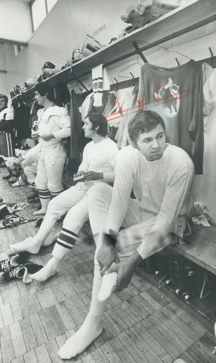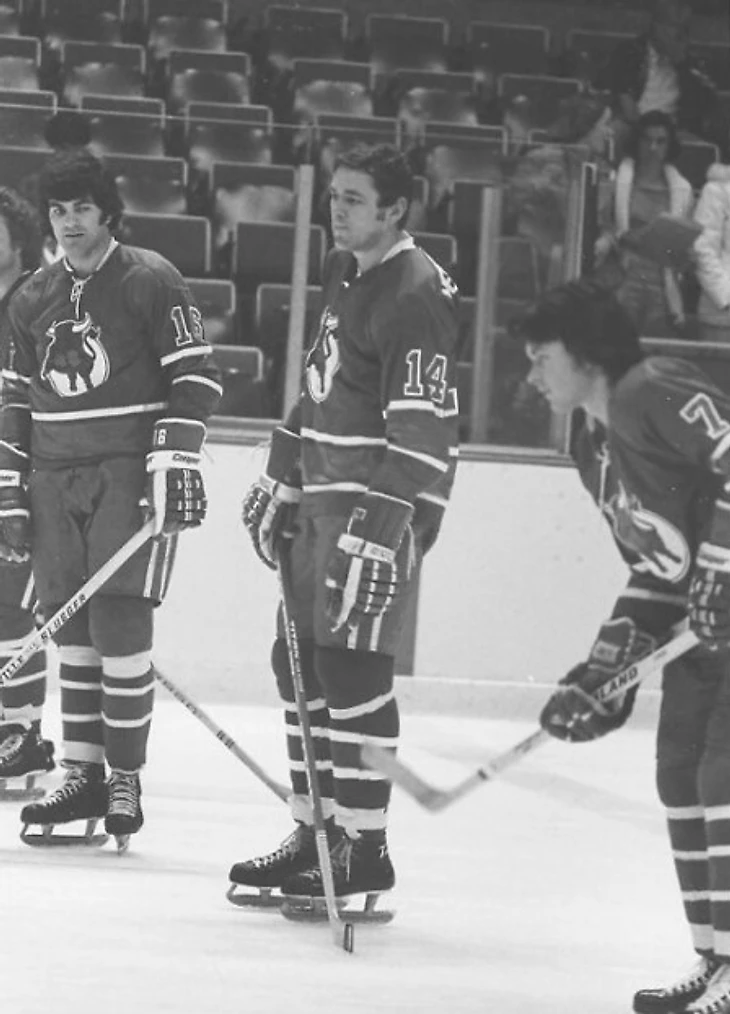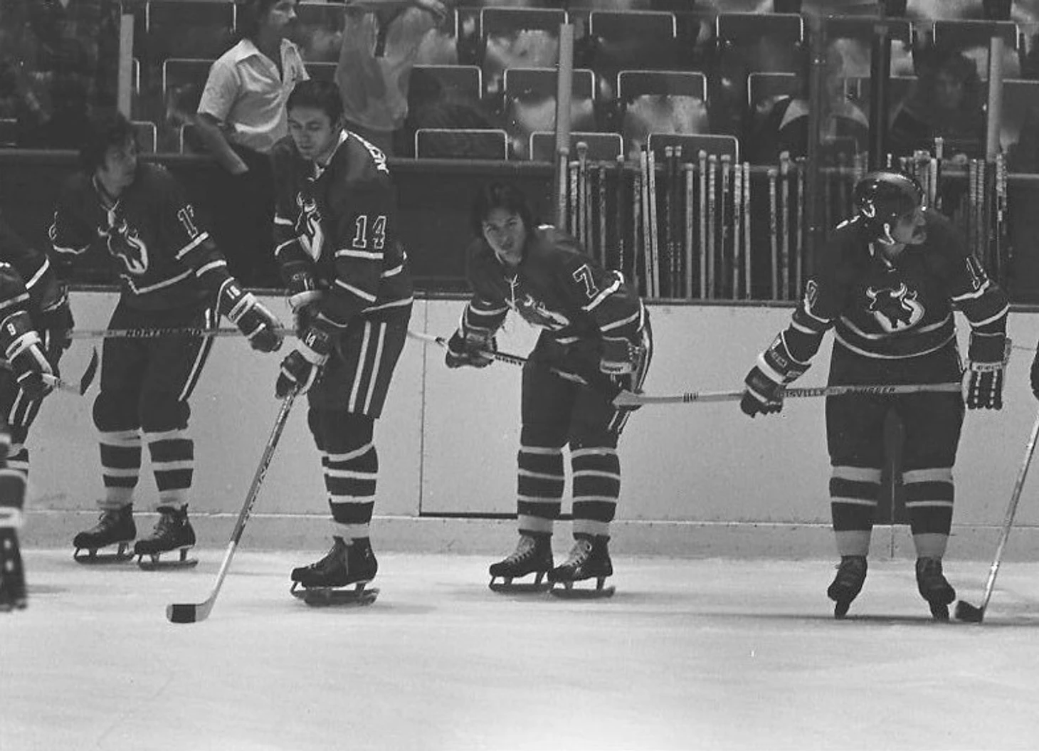 Сезон 1974/75 годов. Торонто. «Мэйпл Лиф Гарденс». «Торонто Торос» - «Виннипег Джетс». Недомански - второй слева (nitzyshockeyden.blogspot.com)