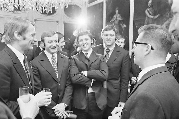 1972 год. Прага. Дом правительства. Чемпионы мира и Европы хоккеисты сборной ЧССР (слева направо): Ярослав Холик (10 игр, 8 шайб и 7 передач), Ян Клапач (10 игр, 9+6), Рихард Фарда (8 игр, 3+4) и Вацлав Недомански (10 игр, 9+6) на приеме у председателя правительства Чехословакии Любомира Штроугала (denik.cz)